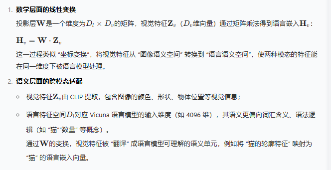 - 跨模态对齐: 通过投影层将视觉特征映射到语言空间